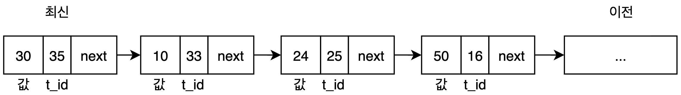 MySQL은 레코드가 변경될 때마다 이전 레코드의 데이터를 Undo Log라는 곳에 저장해 버저닝합니다. 이 Undo Log들은 링크드 리스트처럼 구성됩니다.