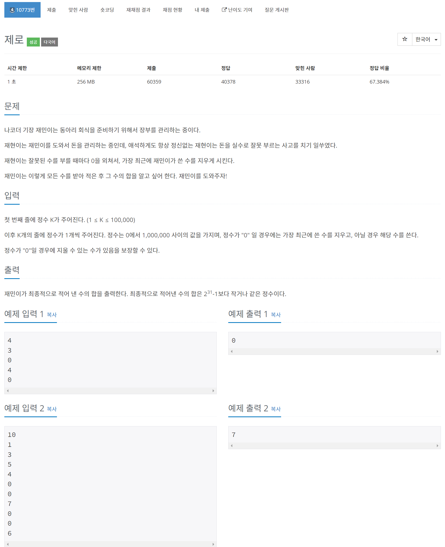 Stack을 이용해 푸는 간단한 문제다. Stack을 직접 구현할 수도 있지만, java.util에서 제공하는 Stack을 이용해 풀어보겠다. 0이 아닌 정수를 입력받으면 push 하고 0을 입력받으면 pop을 하면 된다(0일 경우 지울 수 있는 수가 있음을 보장하기 때문). 모든 Stack 데이터 삽입/삭제가 완료된 후, Stack을 순환하며 값을 더해주면 된다.
