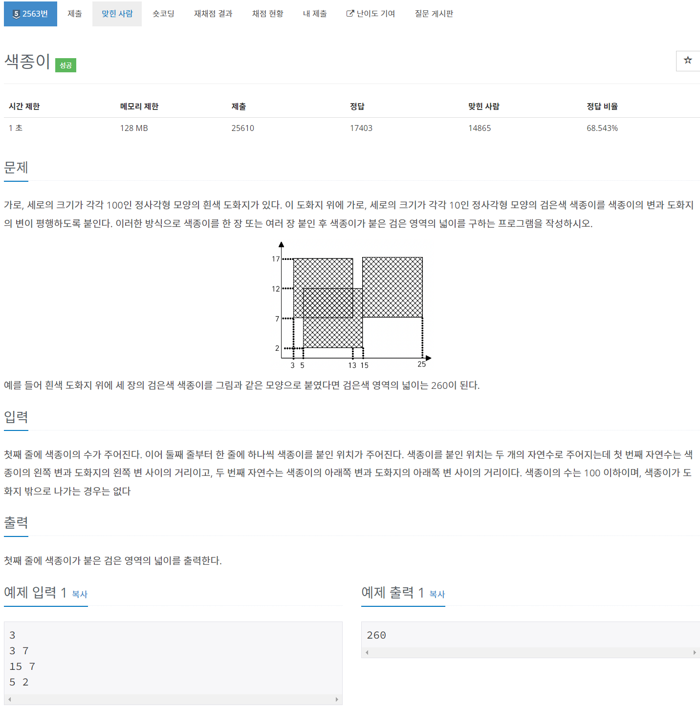 색종이가 겹치는 경우의 수는 너무 많아서 그냥 도화지를 만들고 한칸씩 칠해나가는 방법으로 문제를 해결했다.