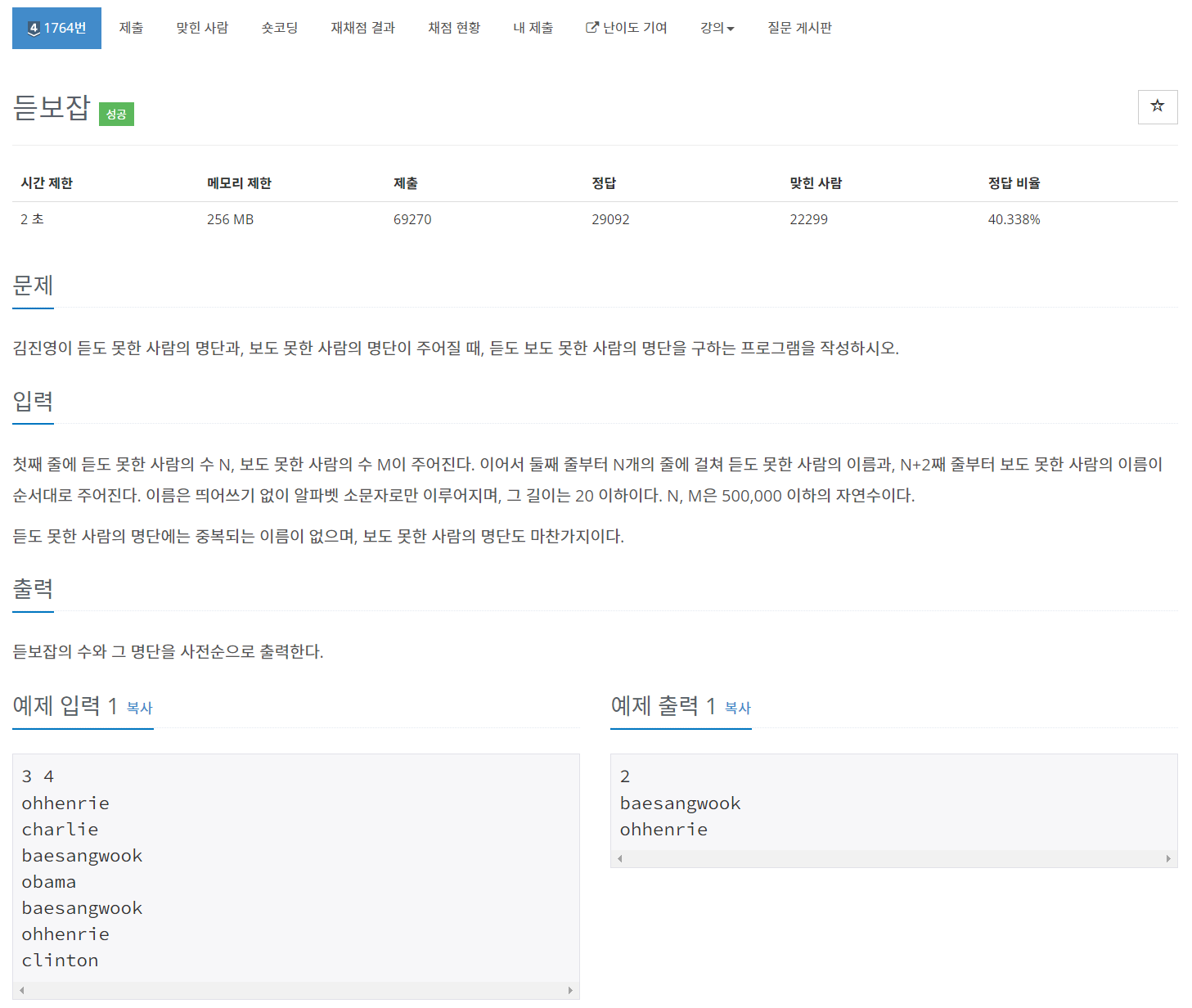 보도 못한 사람을 입력받으면서 듣도 못한 사람에도 포함되는지 검사한다.