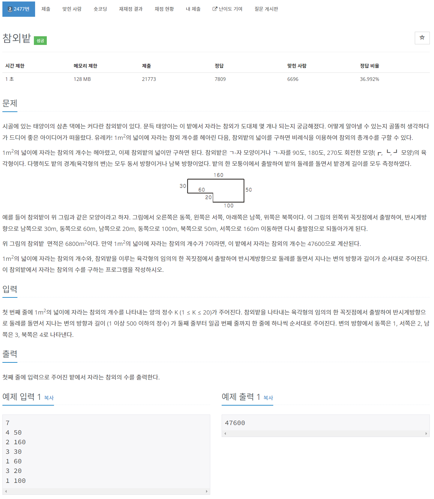 출력은 전체 면적에서 빼야 할 면적을 뺀 후 면적 당 참외의 수를 곱하면 된다.