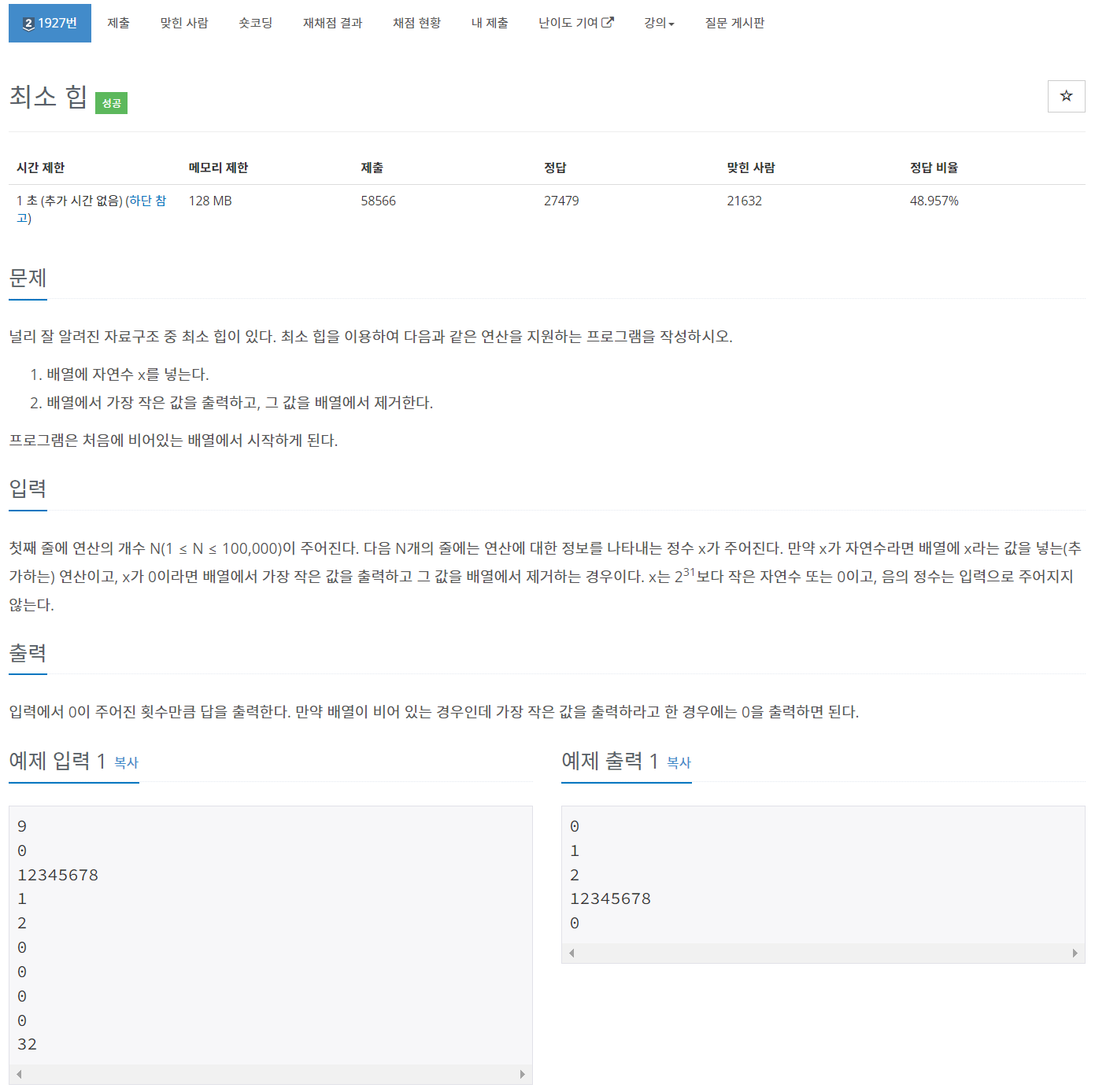 오름차순으로 우선순위가 되는 PriorityQueue를 선언하고 0이 입력되면 PriorityQueue가 비어있는지 확인 후 출력한다.