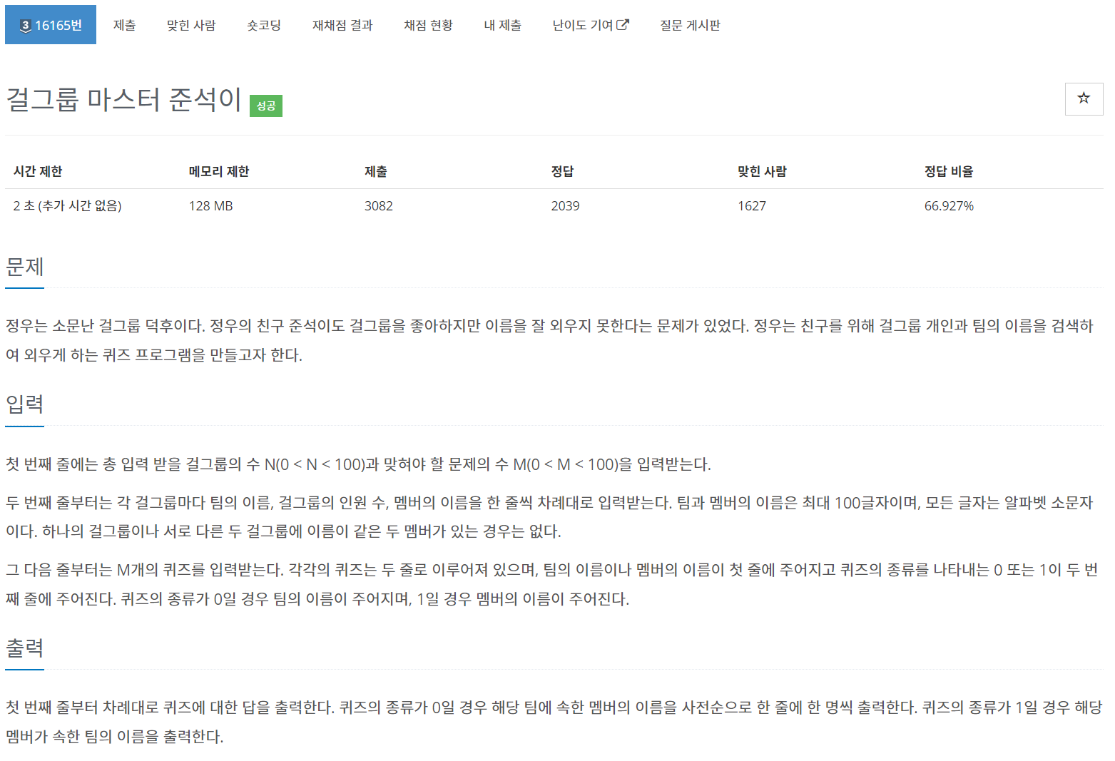 익숙한 문제이다. HashMap<String, String[]>을 써서 그룹명을 key로 가지고 멤버를 value로 가지게 한 후, 문제 유형에 따라 처리하면 된다.