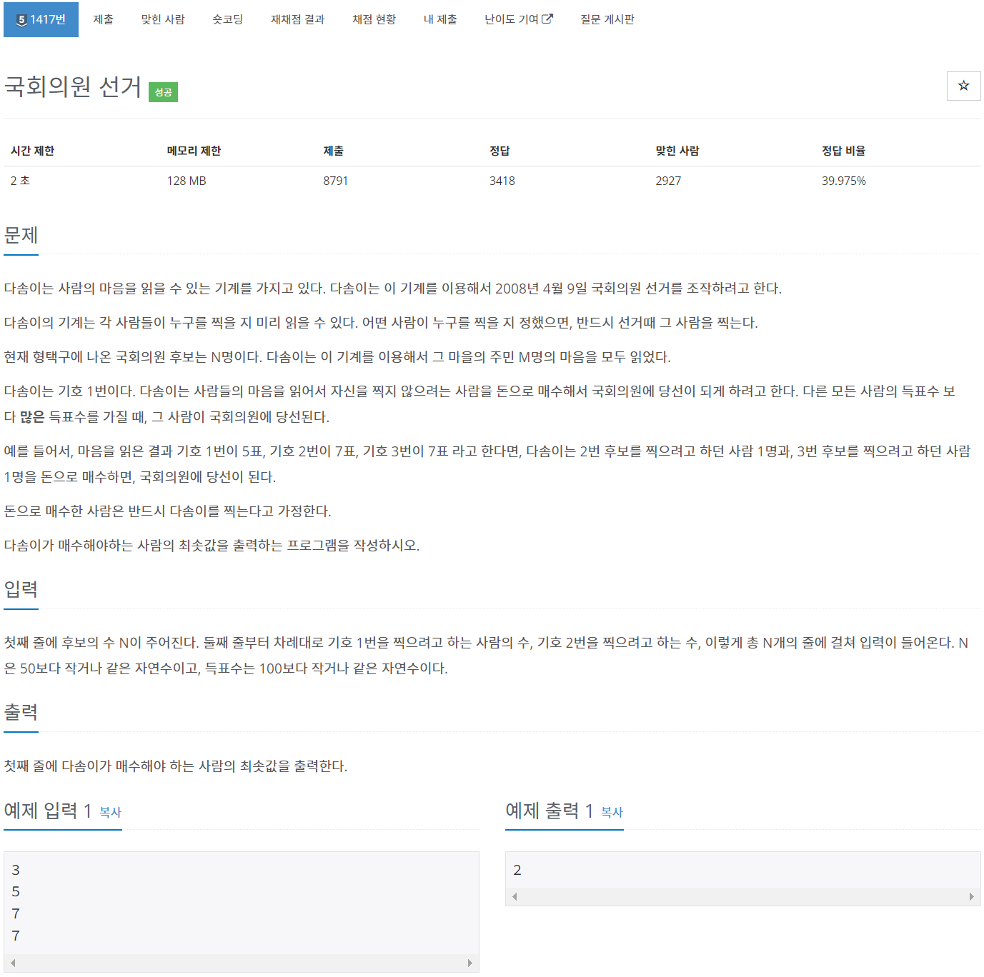 우선 다솜이는 기호 1번이기 떄문에 후보 수롤 입력받은 후 후보 수 - 1 만큼의 Integer 배열을 생성하고 다솜이의 득표수를 저장할 int 변수를 따로 만든다.