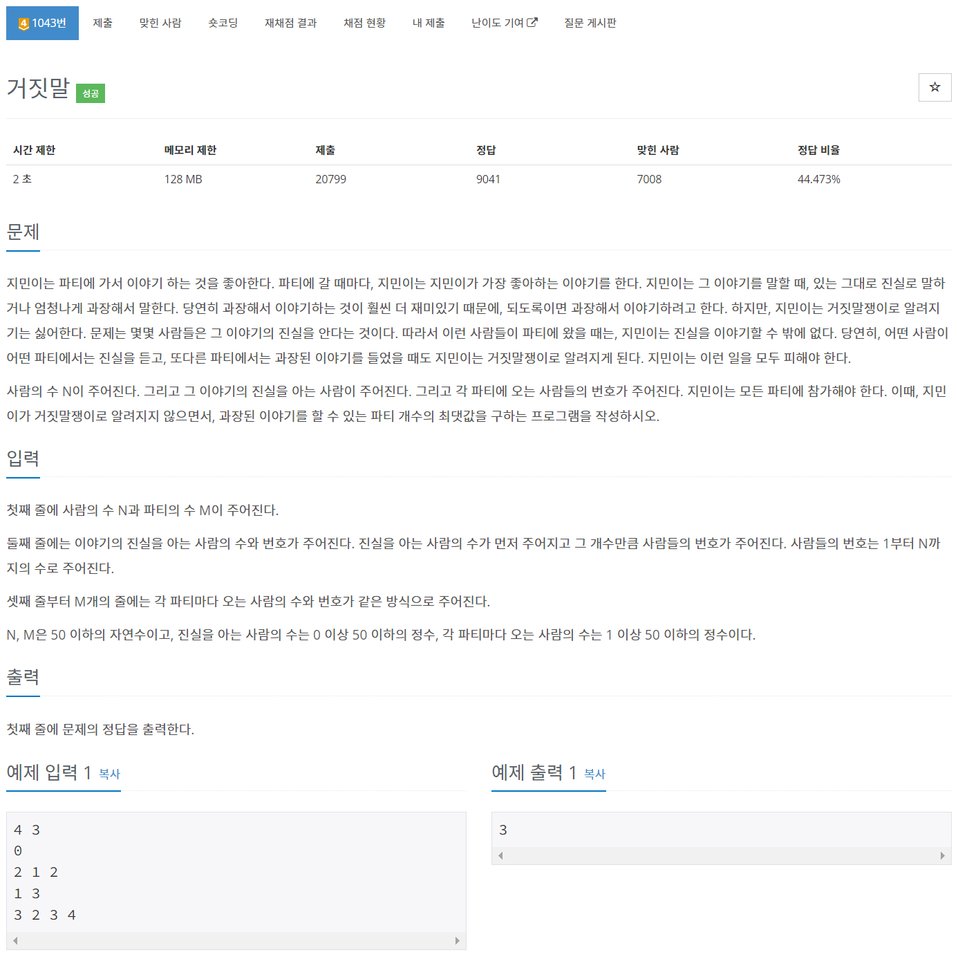 이렇게 하면 진실을 아는 사람이 한 명도 없는 파티의 개수가 result에 저장된다. result를 출력하면 끝이다.