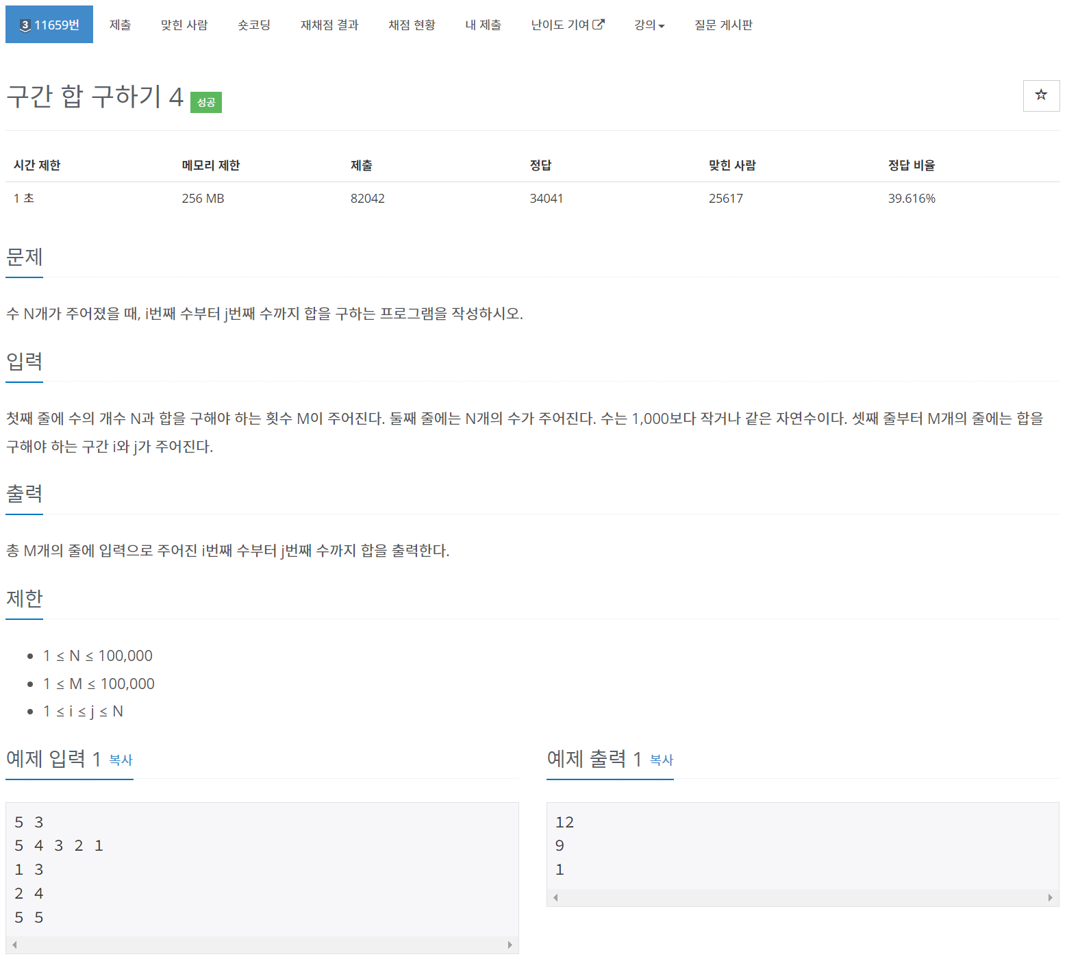 구간 합을 이용해 간단하게 풀 수 있는 문제이다. 배열을 사용해 수를 입력받으면서 구간 합을 저장하면 된다.