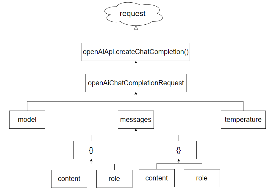 openAIApi 변수의 createChatCompention() 함수를 통해 요청을 보내는 것이고, 그 안에 매개변수로 openAiChatComplentionRequest가 들어간다.