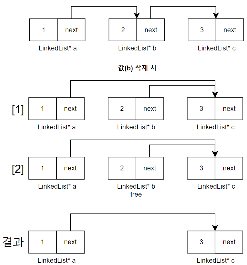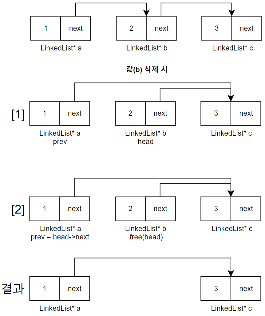 우선, 2라는 값을 가진 LinkedList를 삭제한다고 가정한다. head를 사용해 2를 가진 LinkedList*를 찾을 때까지 head를 head->next로 만들어준 뒤, 찾았다면 head 이전의 LinkedList(prev)의 next를 head의 next로 만들어준다. 이건 코드로 보면 이해가 더 쉬울 것 같다.