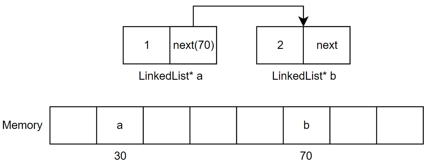 이렇게 하면 두 개의 LinkedList가 연결되었다. a의 next가 b의 주소를 가지게 되었으니, a->next로 b에 접근이 가능하다. 코드로는 이렇게 나타낼 수 있다.