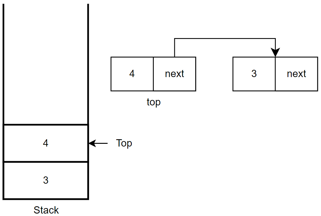 Stack은 멤버 변수로 top, size를 가질 수 있다. LinkedList* top은 stack에 저장된 데이터들의 top의 주소를 가진다. 가장 마지막에 추가된 데이터를 가지고 있을 테니 그림으로 보면 다음과 같다.