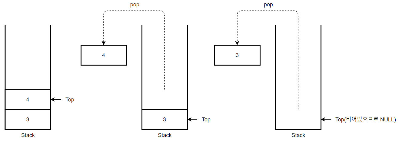 Stack에 pop을 하면 Stack의 가장 위(Top)에 있는 데이터를 제거하고 반환한다.