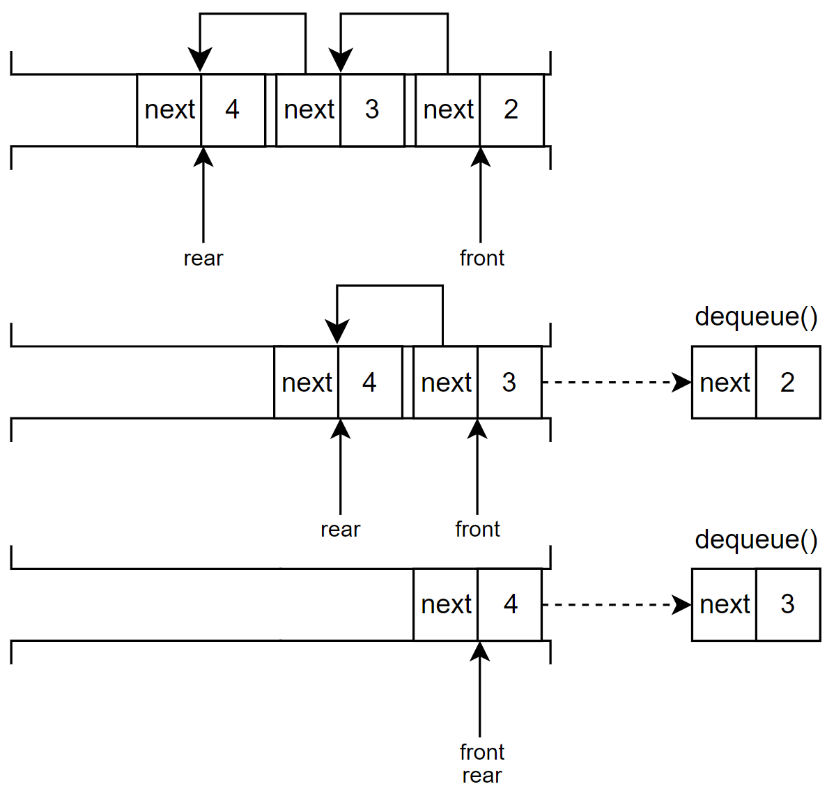 rear에서 front로 가는 것이 언뜻 보면 더 직관적이고 쉬워 보일 수 있다. 하지만, dequeue에서 문제가 발생한다. dequeue 연산을 한번 보자.