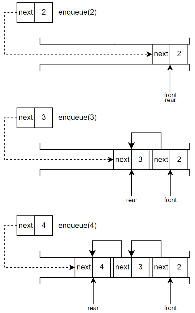 매개변수로 받은 데이터를 담는 newLinkedList를 만들고, rear의 next를 newLinkedList로 만든다. 그러고 나서 rear를 newLinkedList로 만들어주면 된다. 흐름은 다음과 같다.