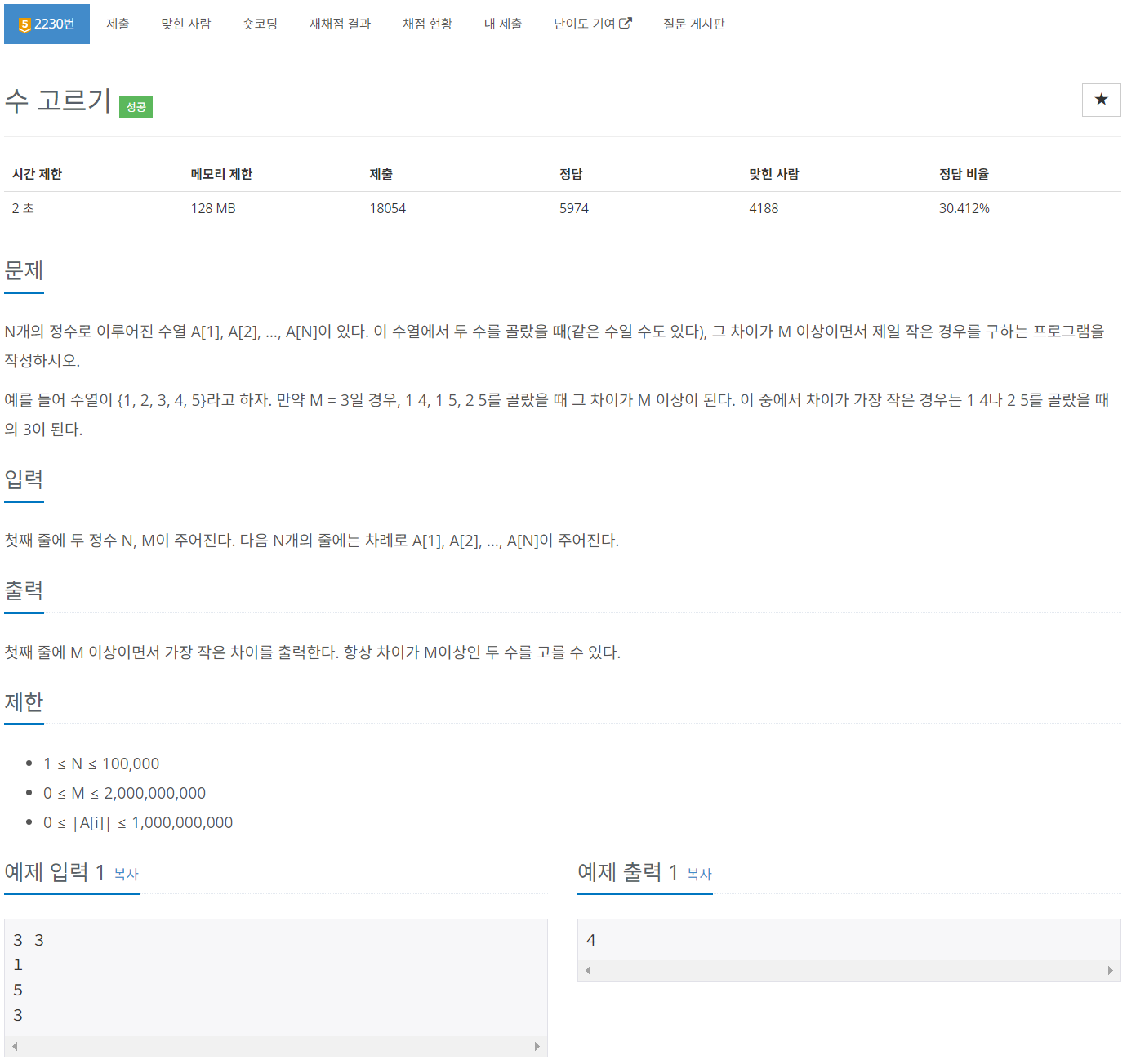 정렬된 배열이므로, p2 - p1이 M보다 크거나 같은 순간, p1++을 해 주고, result를 갱신하면 된다. 그게 아니라면 p2++을 통해 2번째 포인터를 증가시켜주면 된다. 마지막으로 result를 출력해주면 된다.