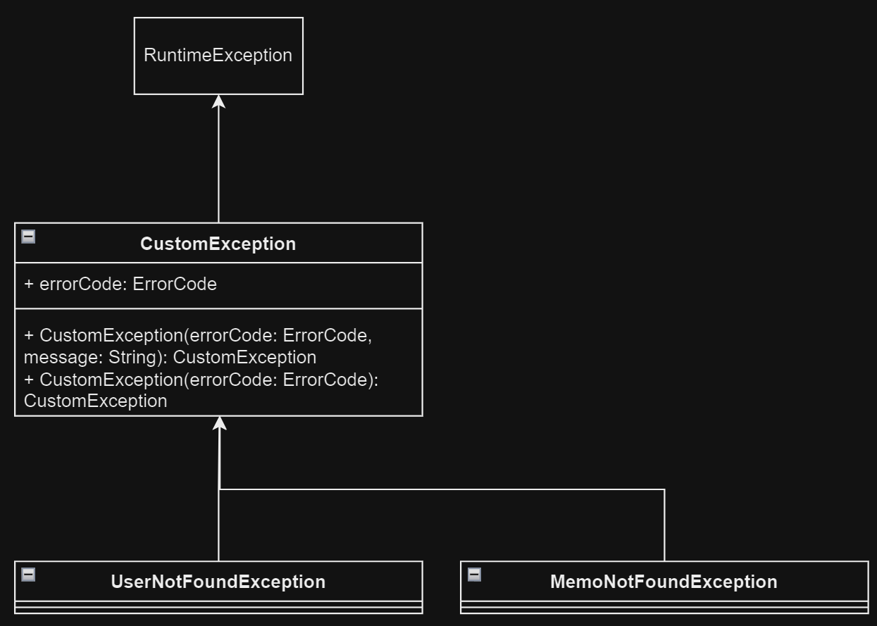 3. 이 CustomExcption을 상속받는 예외 클래스(UserNotFoundException, MemoNotFoundException)를 추가한다.