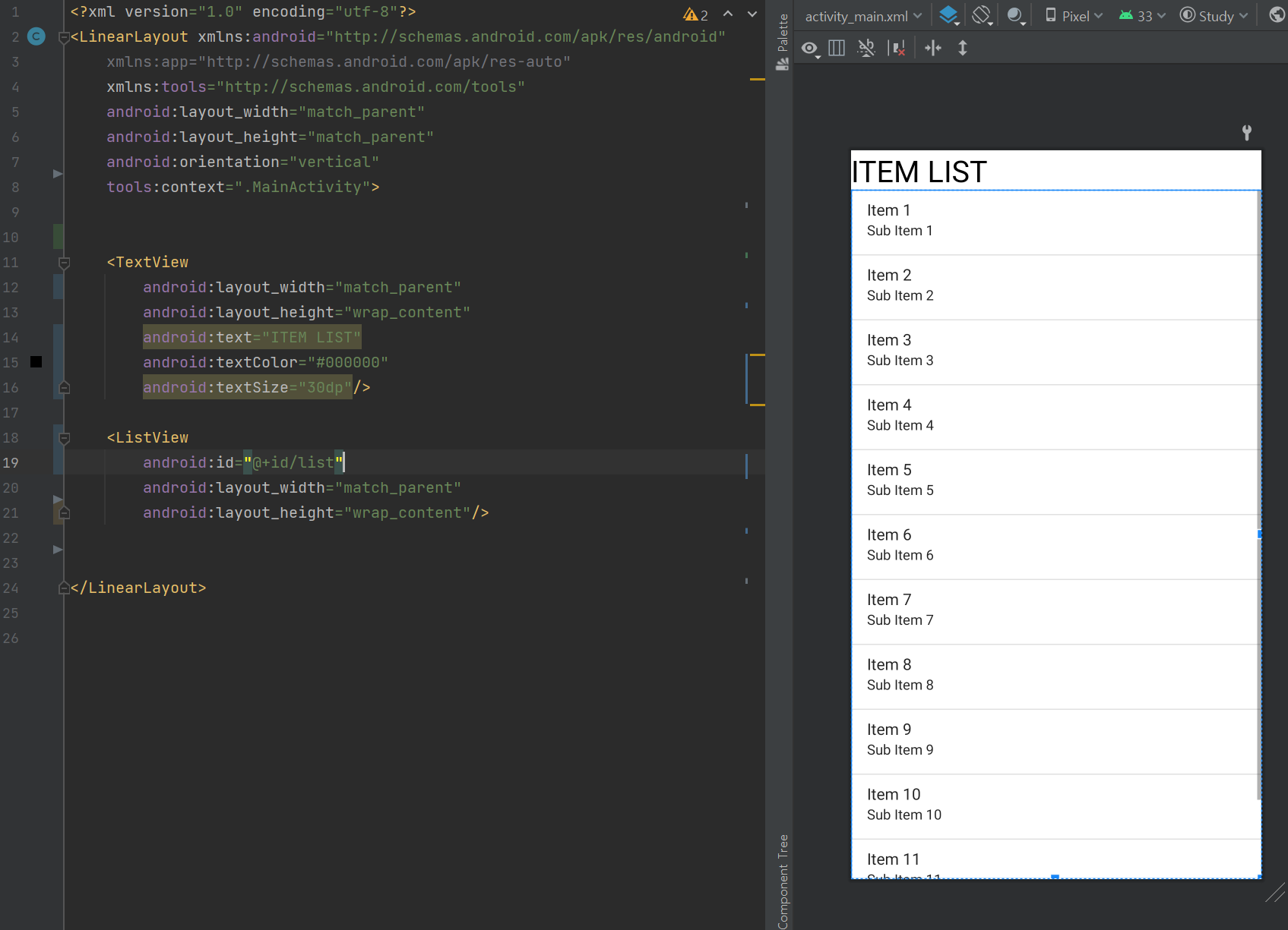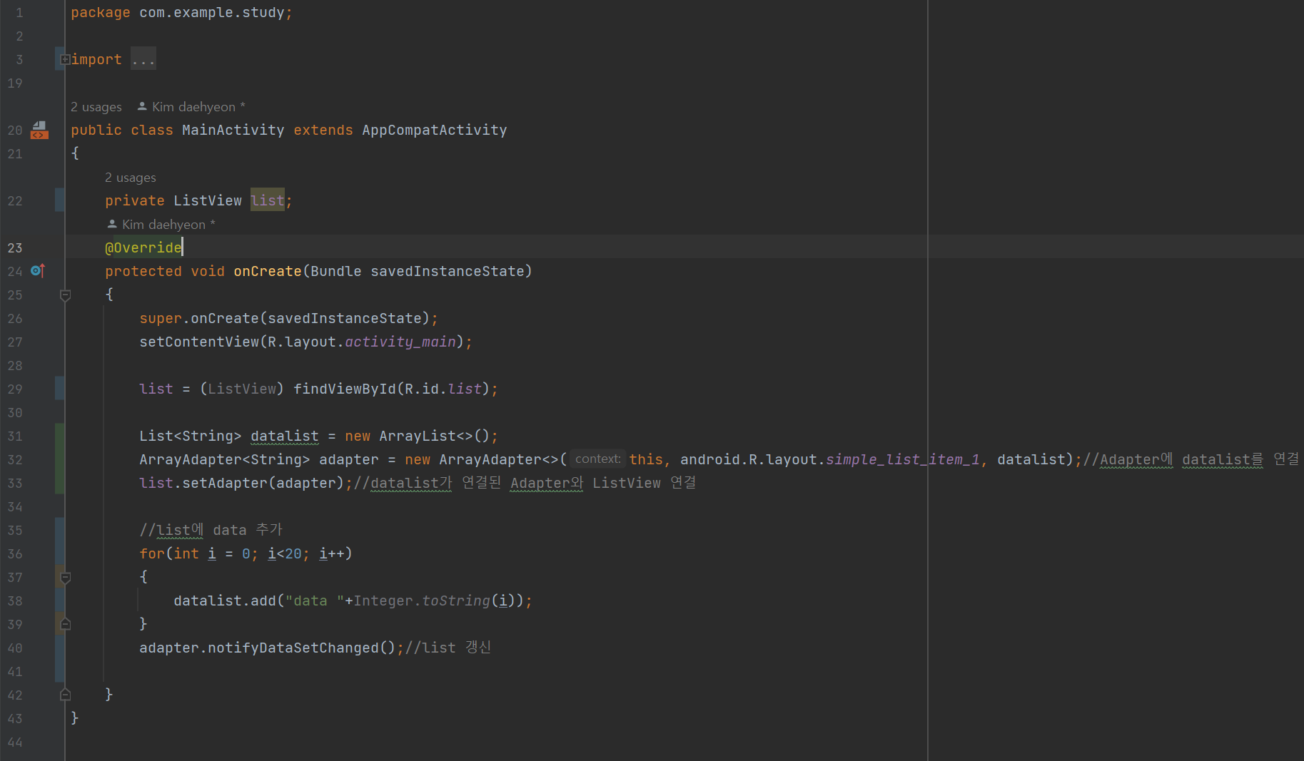 우선 xml파일에 ListView를 추가했고, java 파일에 String을 저장하는 ArrayList를 만든 후 Adapter와 ArrayList를 연결, ListView와 Adapter를 연결했다.