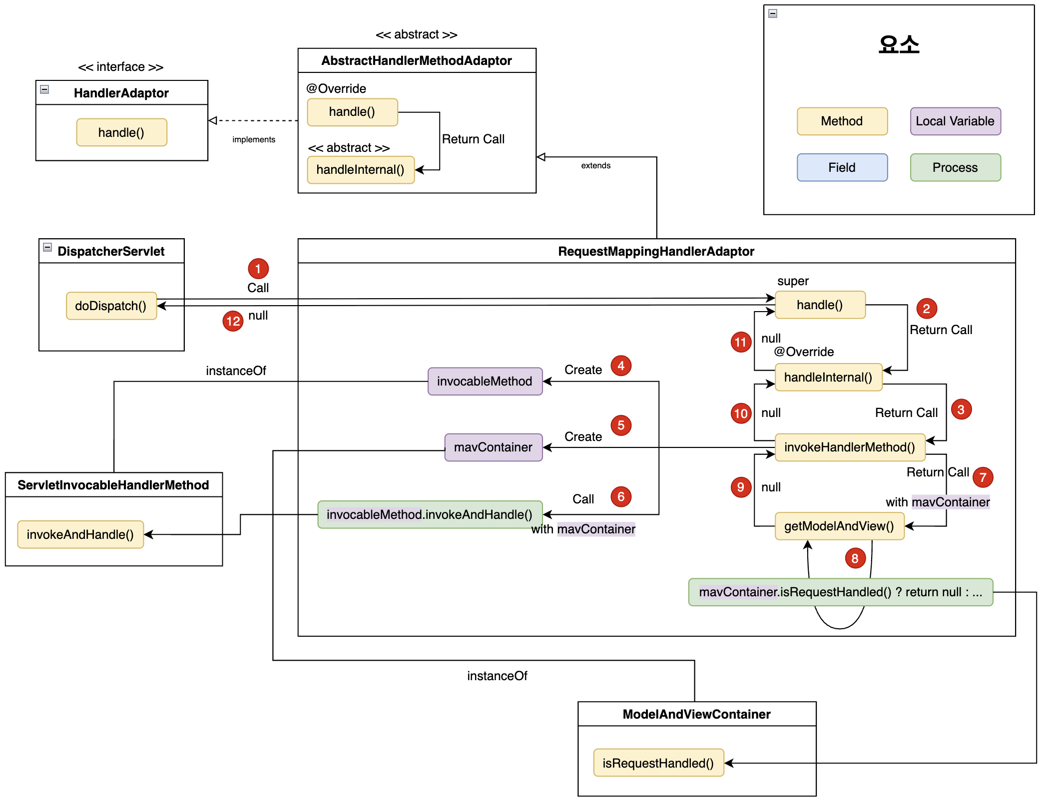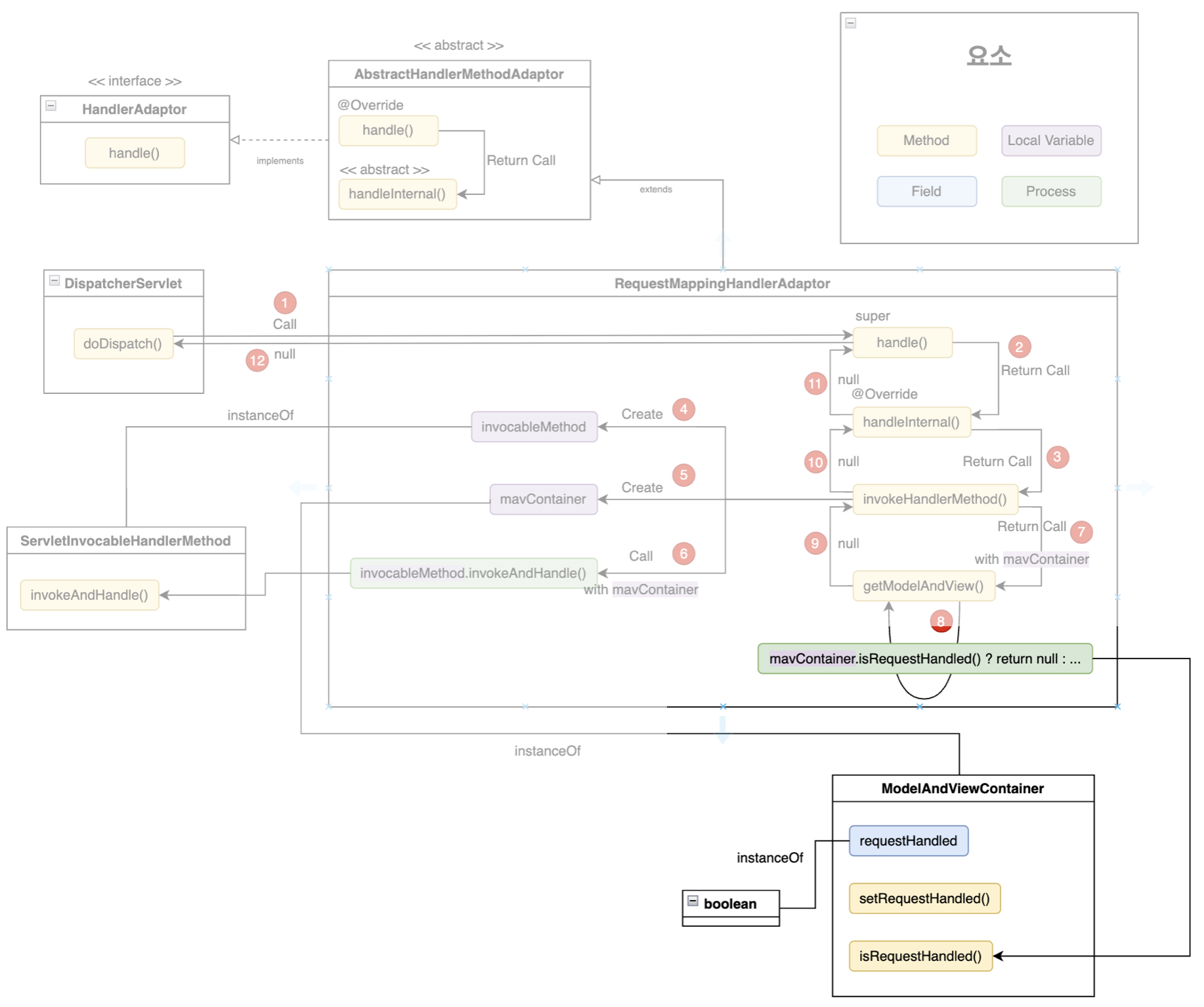 - RequestMappingHandlerAdaptor 의 handleInternal() 은 RequestMappingHandlerAdaptor 의 invocableMethod 필드의 invokeAndHandle() 을 호출