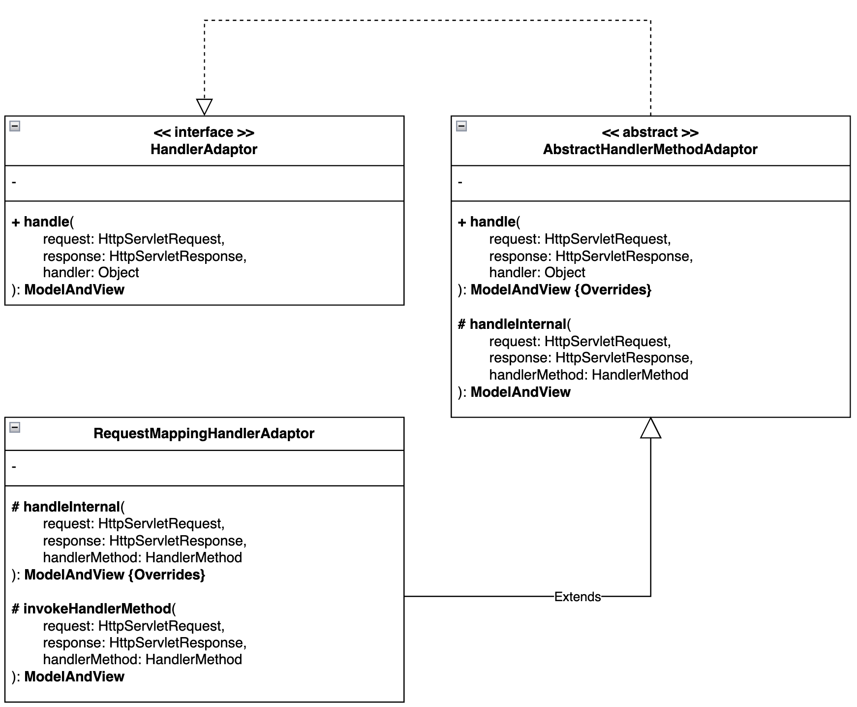 - RequestMappingHandlerAdaptor 는 handle() 의 주요 로직을 handleInternal() 로 구현하고 있음.